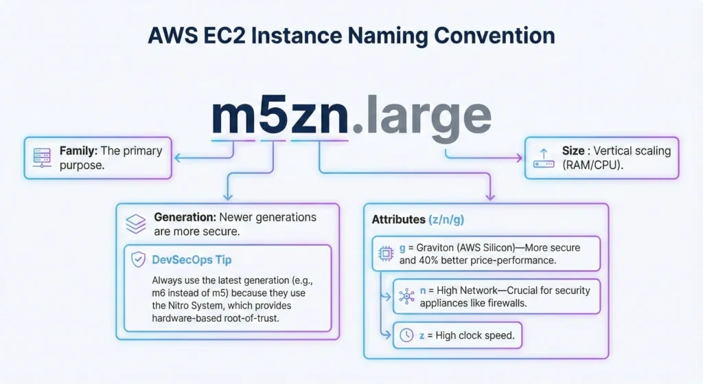 m= Family: The primary purpose.5= Generation: Newer generations are more secure. DevSecOps Tip: Always use the latest generation (e.g., m6 instead of m5) because they use the Nitro System, which provides hardware-based root-of-trust.- Attributes (z/n/g):