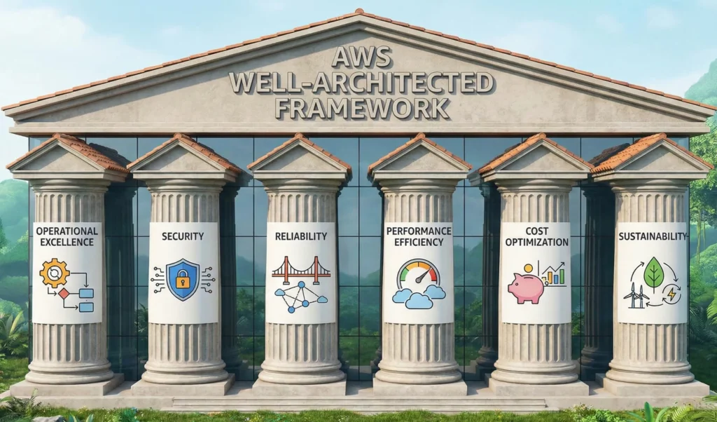 The AWS Well-Architected Framework is a collection of best practices, design principles, and guidelines. It helps you understand if your cloud “house” is built correctly. It prevents you from making common mistakes that could lead to your website crashing, getting hacked, or costing too much money.