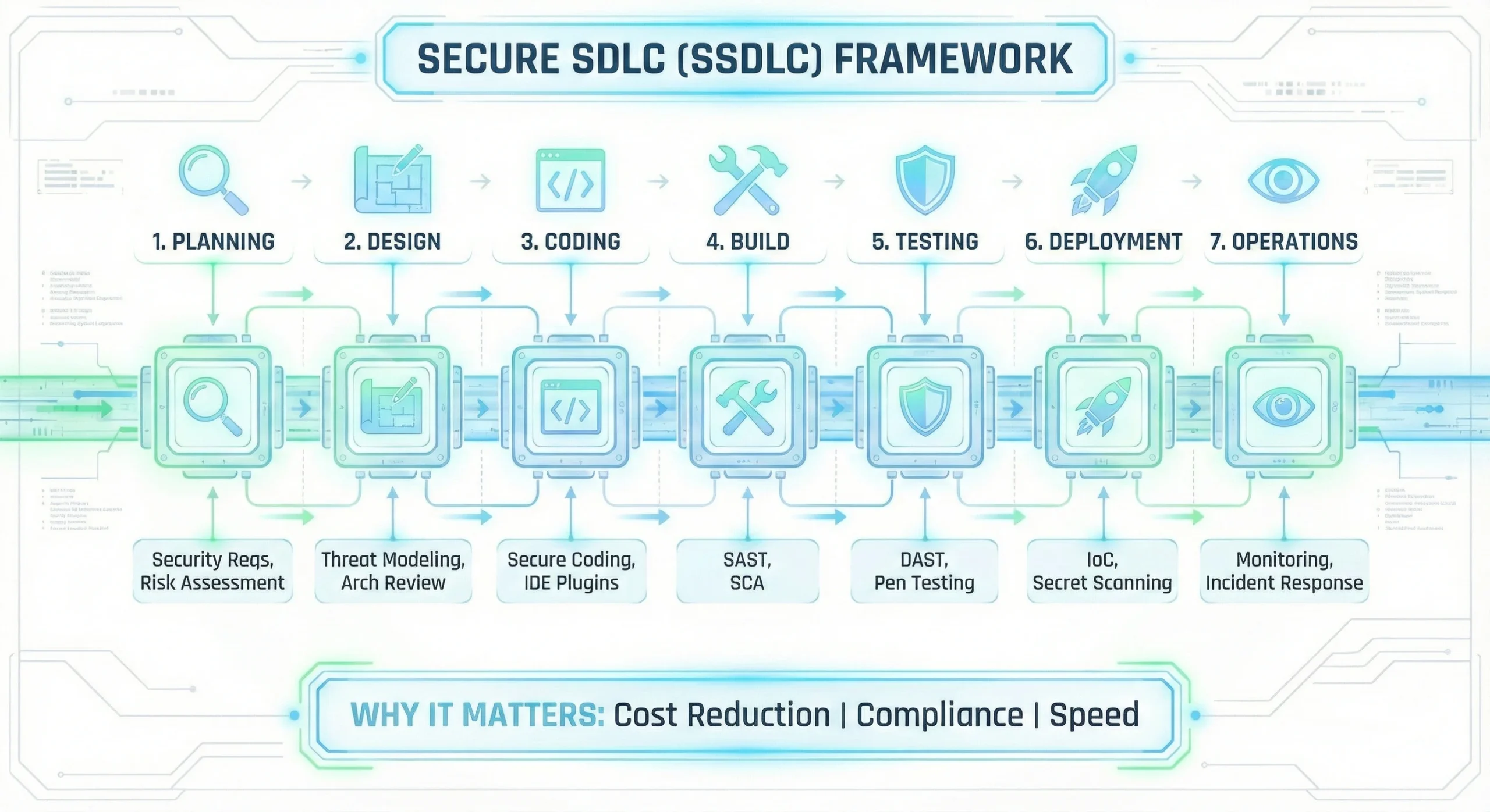 The Secure Software Development Life Cycle (SSDLC) is a framework that integrates security activities into every phase of software development from the first whiteboard sketch to the final line of code in production.