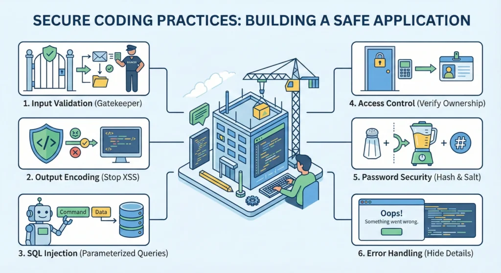 - No Hardcoded Secrets: – Never put passwords or API keys directly in the code.
