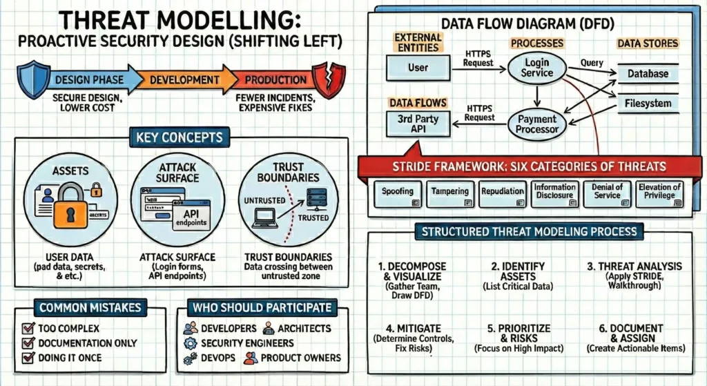 - Threat Modeling: – A brainstorming session (using methods like STRIDE) where the team asks, “How would a hacker attack this design?” and “What happens if the database fails?”