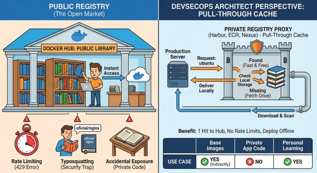 - Impact: If your production cluster tries to auto-scale and pull 500 images at once, Docker Hub blocks you. Your scaling fails, and your website goes down.