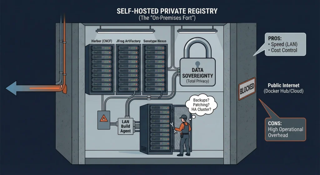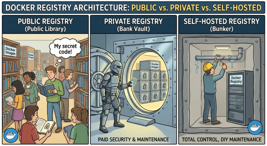 - Self-Hosted Registry (Bunker): You build the vault yourself inside your own basement. You have total control, but if the roof leaks (server crashes), you have to fix it yourself.