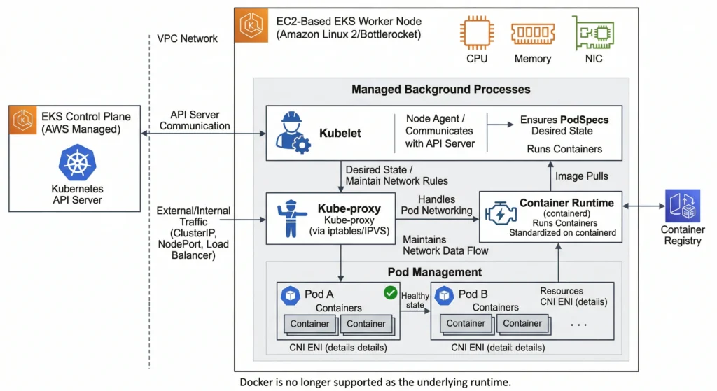 • Container Runtime: The software responsible for running containers. EKS standardizes on containerd (Docker is no longer supported as the underlying runtime).