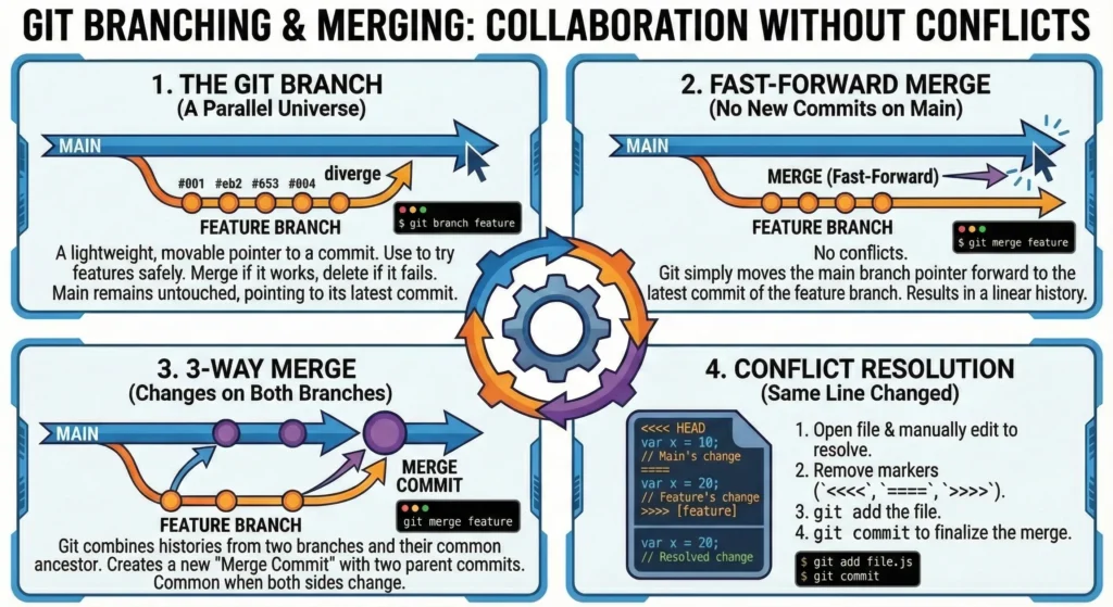 | git merge –abort | Stop a merge that has conflicts and return to safety. | Use if conflict resolution gets too confusing. |