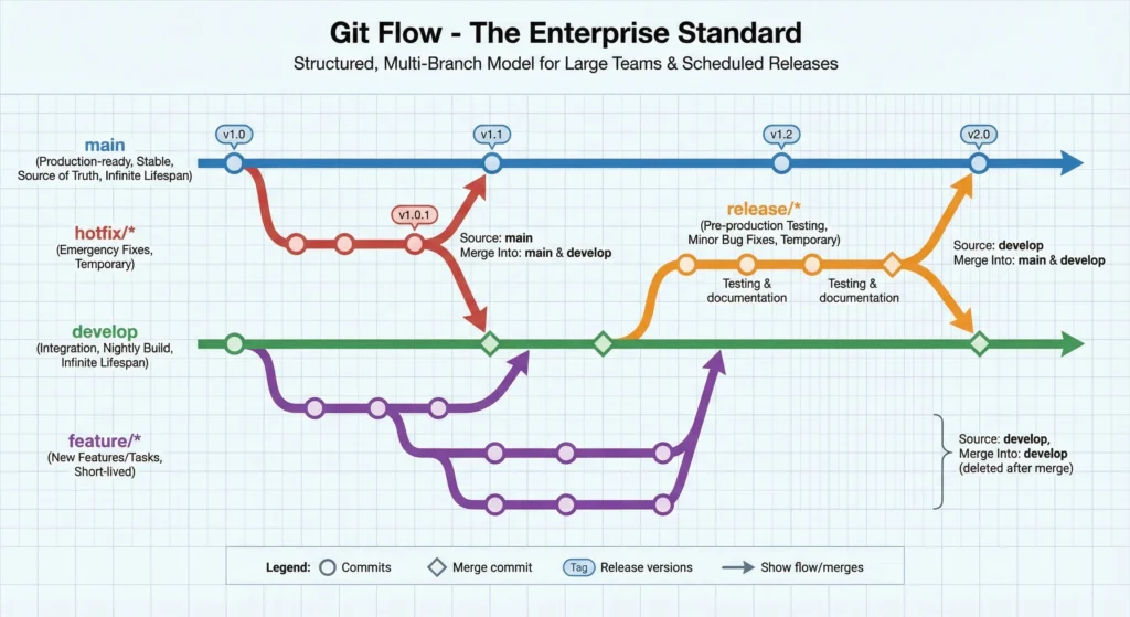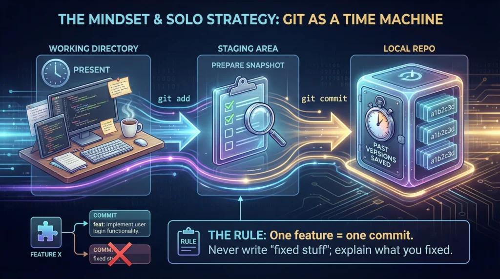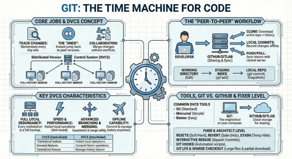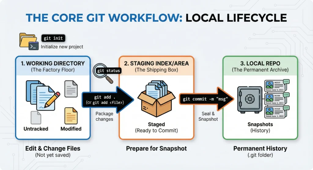 - Staging Area (Index): A virtual “loading dock.” This allows you to perform Atomic Commits—you might have changed 10 files but only “stage” 2 that belong to a specific bug fix.