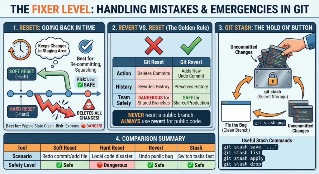 - Rule: If the code is already on GitHub, always Revert. Resetting public history causes “Merge Hell” for teammates.