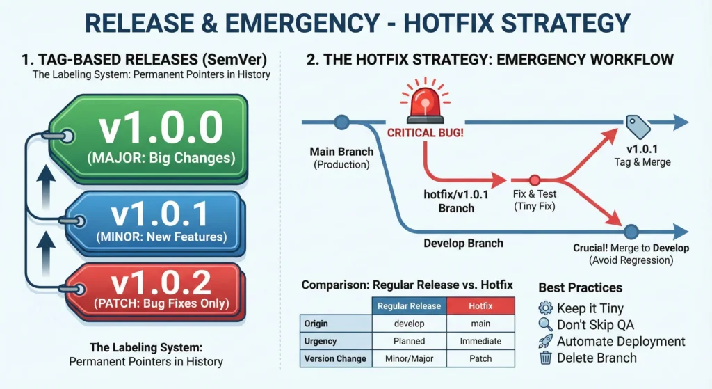 | git tag -a v1.0 -m “Msg” | Create an annotated tag. | Best for official releases (stores who tagged it). |