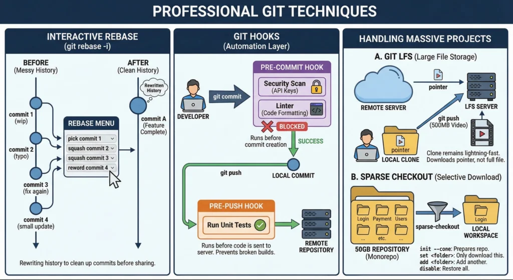 - Server-side: pre-receive (enforces commit message formats or blocks large files on the server).