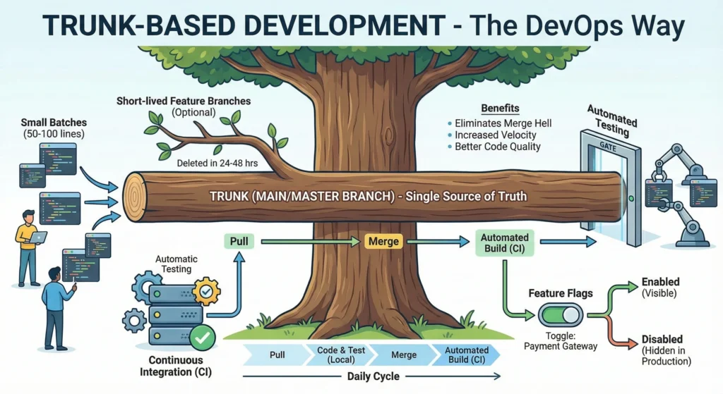 - A strategy where everyone merges to main at least once a day. It requires Feature Flags (toggles in the code) so that unfinished features can be merged into production without being visible to users.
