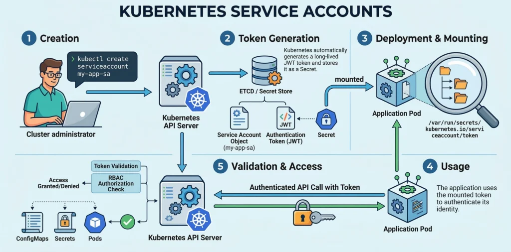 /var/run/secrets/kubernetes.io/serviceaccount/token. The Pod uses this token in its HTTP headers to talk to the API Server. - Security Benefits: Modern tokens are time-bound (they expire and rotate automatically), audience-bound (tied specifically to the API server), and object-bound (if the Pod is deleted, the token instantly becomes invalid).