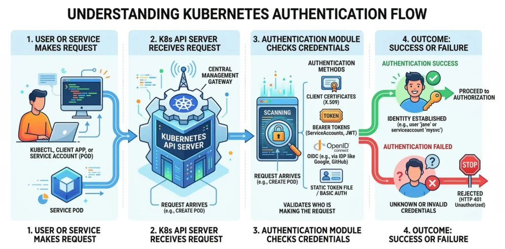 Kubernetes does not have a native “User” object or database for humans. It relies entirely on external identity providers for people, while managing internal system components itself. Whenever an HTTP request hits the API server, K8s extracts credentials and attempts to authenticate it using one or more configured authenticators.