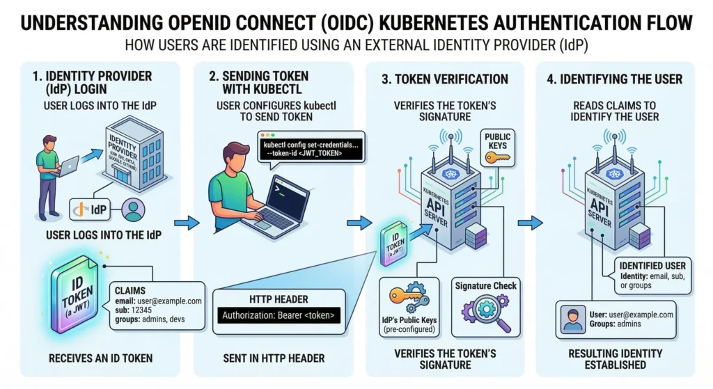 kubectlto send this token to the K8s API Server in the HTTP Header (Authorization: Bearer <token>). - The API Server, pre-configured with the IdP’s public keys, verifies the token’s signature.