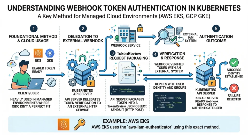 | Webhook (AWS IAM) | Bouncer asking a Manager | Managed clouds (EKS, GKE). | Highest (Native cloud integration) |