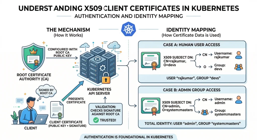 - How it Works: The API server is configured with a root Certificate Authority (CA). Any client certificate signed by this CA is trusted.