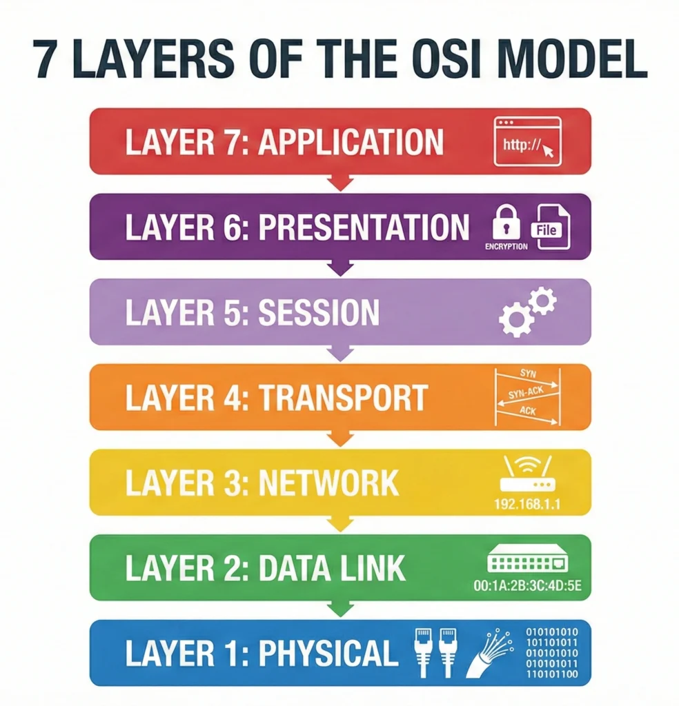 The OSI (Open Systems Interconnection) model is a conceptual framework. It explains how data travels from your screen, through the wire, to a server, and back. It breaks this complex journey into 7 Layers.